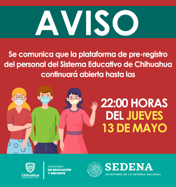 Chihuahua, Chih. – La Secretaría de Educación y Deporte (SEyD) informó que a las 22:00 horas de este jueves 13 de mayo, se cerrará la plataforma de pre-registro del personal del Sistema Educativo del Estado de Chihuahua para la vacunación contra COVID-19, que se efectuará los días 18 y 19 de mayo.