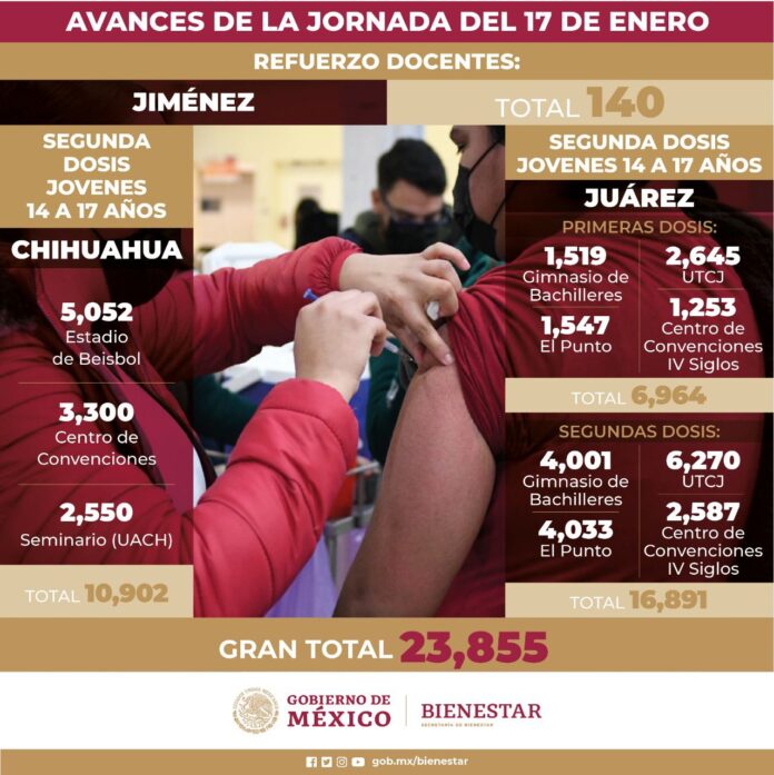 Ciudad Juárez, Chih. (ADN / Martín Orquiz) – Entre adolescentes que recibieron la primera o segunda dosis, así como docentes a quienes se aplicó la tercera de refuerzo contra el COVID-19, ayer se logró inocular a 23 mil 855 personas, dio a conocer personal de Bienestar.