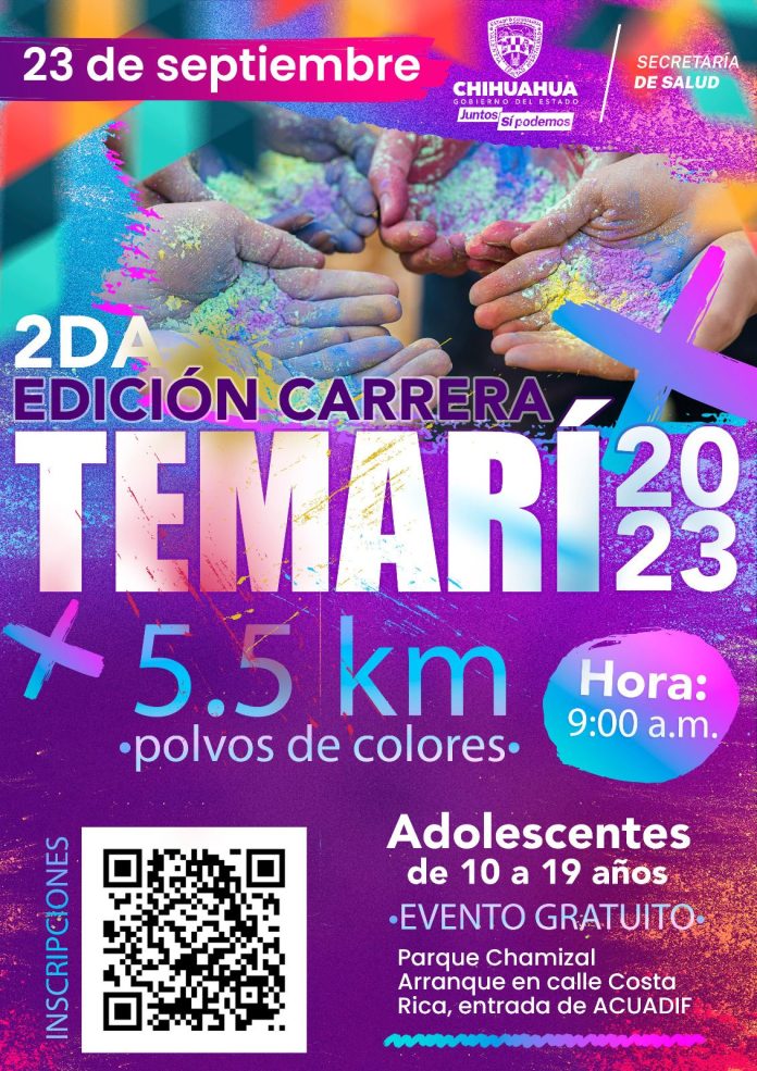 Chihuahua, Chih .- La Secretaría de Salud del Estado a través de la Jurisdicción Sanitaria II, lanzó la convocatoria de registro para la segunda edición de la carrera de colores Temarí 2023, que se realizará el próximo 23 de septiembre en el Parque El Chamizal, en el marco de la Semana Nacional de Salud en la Adolescencia.