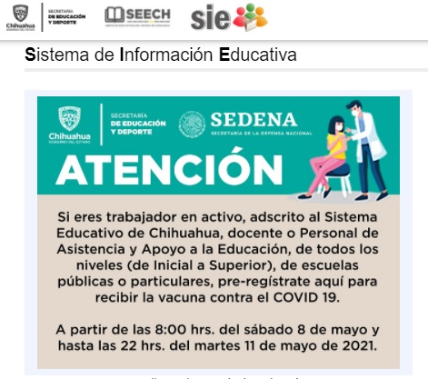 El funcionario invitó al personal educativo a realizar su pre-registro a través del portal del Sistema de Información Educativa (SIE): https://sie.chihuahua.gob.mx/vacuna/.