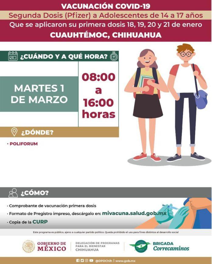 En el Municipio de Cuauhtémoc se atenderá a los menores de 14 a 17 años que recibieron la primera dosis el 18, 19, 20 y 21 de enero.