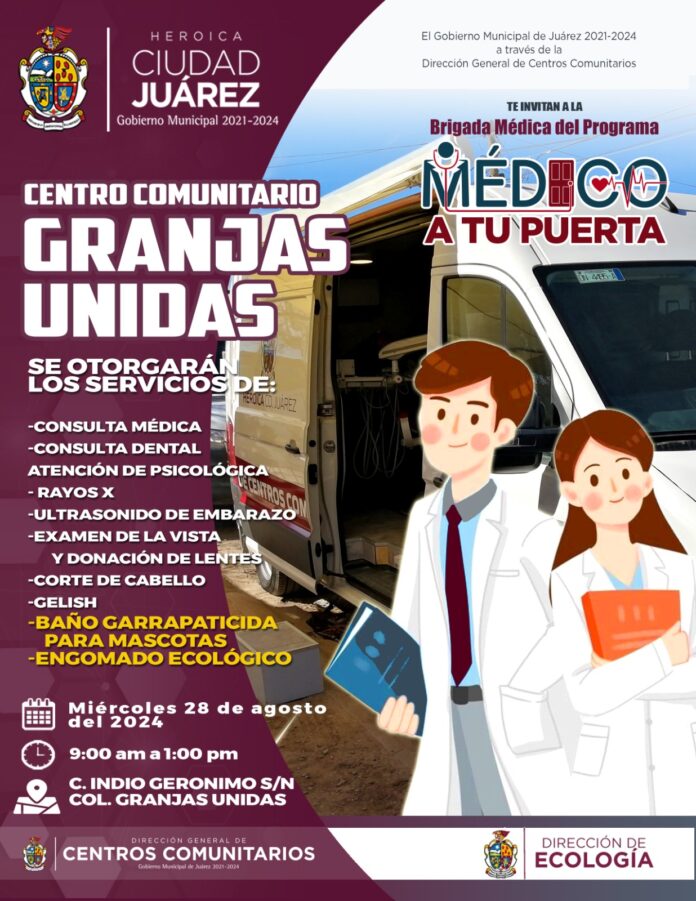 La Dirección General de Centros Comunitarios invita a los vecinos de la colonia Granjas Unidad a la brigada médica del programa “Médico a tu Puerta”, que se llevará a cabo mañana miércoles 28 de agosto.