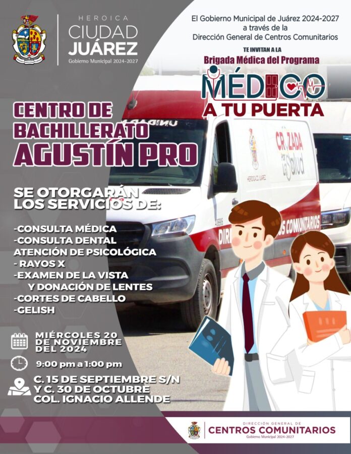 El Gobierno Municipal de Juárez 2024-2027, a través de la Dirección General de Centros Comunitarios, llevará a cabo la Brigada del Programa “Médico a tu Puerta” en el Centro de Bachillerato Agustín Pro.