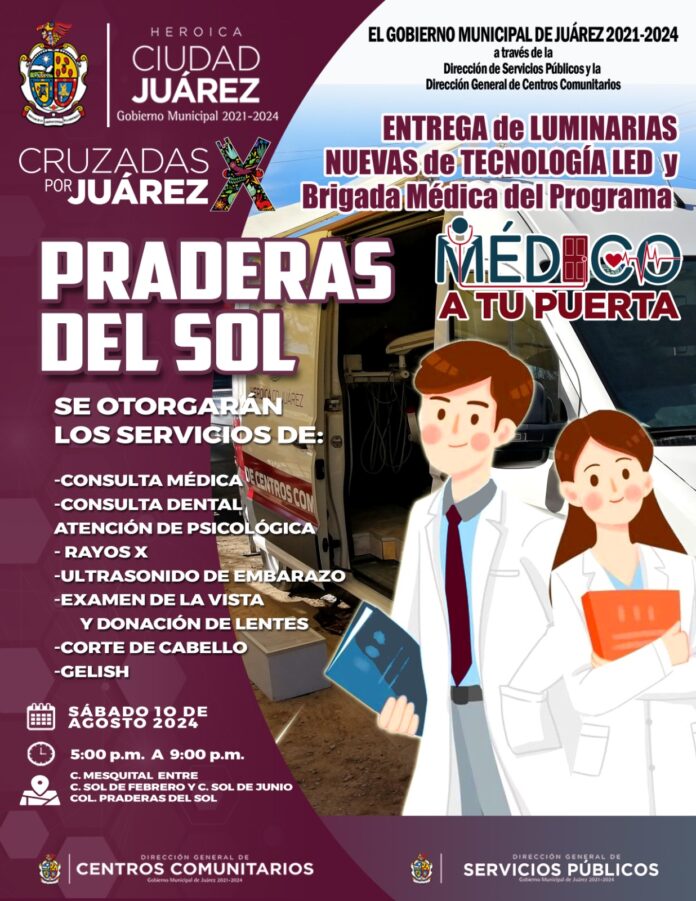 El próximo sábado 10 de agosto, personal de la Dirección General de Servicios Públicos y la Dirección de Centros Comunitarios llevarán a cabo la entrega de nuevas luminarias LED, así como la prestación de servicios con la brigada médica del programa “Médico a tu Puerta”, en la colonia Praderas del Sol.