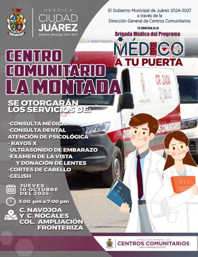 El Gobierno Municipal de Juárez, a través de la Dirección General de Centros Comunitarios, invita a la comunidad a participar en la brigada del programa Médico a tu Puerta, que se llevará a cabo mañana jueves 10, de 3:00 a las 7:00 de la tarde, en el Centro Comunitario La Montada, situado en la calle Navojoa y Calle Nogales, colonia Ampliación Fronteriza.
