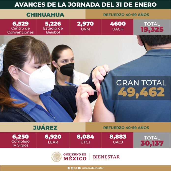 Ciudad Juárez, Chih. (ADN / Martín Orquiz) – Durante el primer día de la mega jornada de vacunación en el estado, 49 mil 462 personas recibieron el refuerzo de AstraZeneca en los Municipio de Juárez y Chihuahua, dio a conocer personal de la Secretaría de Bienestar.