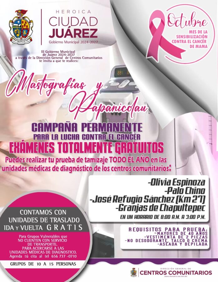 Con el objetivo de contribuir con la salud de las juarenses, el Gobierno Municipal, a través de la Dirección General de Centros Comunitarios, ofrece mastografías y papanicolaou gratis.