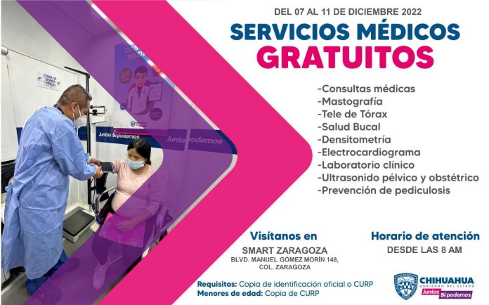 Ciudad Juárez, Chih .- El Gobierno del Estado invita a la comunidad en general, a que acuda a las unidades móviles de salud que estarán instaladas en el estacionamiento del supermercado Smart, que se ubica en avenida Manuel Gómez Morín #148, de la colonia Zaragoza.