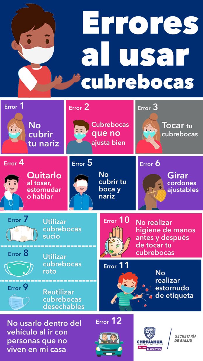 Chihuahua, Chih .- La Secretaría de Salud exhorta a la ciudadanía a seguir practicando las medidas de prevención para evitar el incremento de casos por COVID-19 en el estado de Chihuahua, como es el uso correcto del cubrebocas.