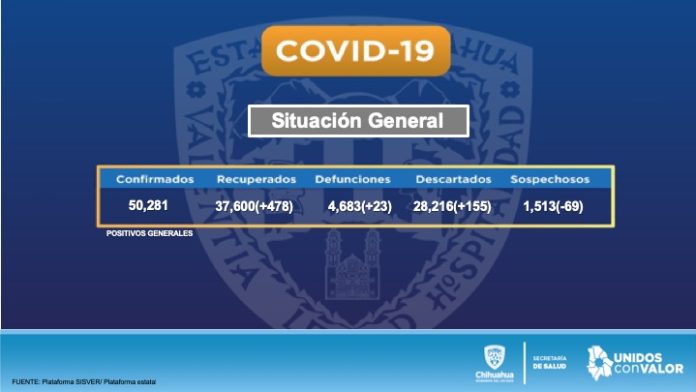 Chihuahua, Chih. – En el lapso de las últimas 24 horas, el estado de Chihuahua alcanzó los 50 mil 281 casos confirmados de COVID-19 y las defunciones llegaron a las 4 mil 683, de acuerdo con el reporte que diariamente emite la Secretaría de Salud.