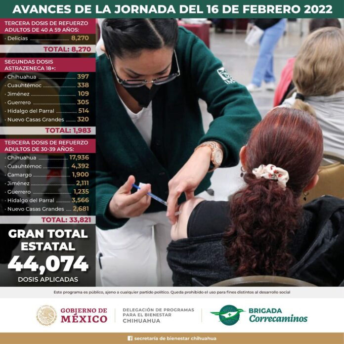Durante la jornada de ayer se inmunizó contra el COVID-19 con tercera dosis a personas de 40 a 59 años en Delicias y de 30 a 39 en otros siete municipios, así como segunda de AstraZeneca para mayores de 18 en Chihuahua.