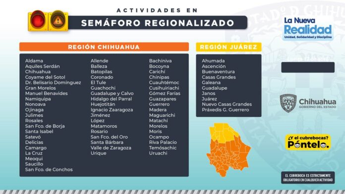 Chihuahua, Chih.- El secretario de Salud, Eduardo Fernández Herrera, informó que ante el aumento de contagios de COVID-19 en las últimas dos semanas, vuelve a operar el semáforo epidemiológico regionalizado, por lo que Región Chihuahua cambia a color naranja y Juárez se mantiene en amarillo.