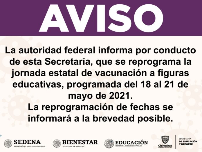 Chihuahua, Chih. – La Secretaría de Educación y Deporte ha sido informada de la reprogramación de la jornada de vacunación al personal de todo el sector educativo del estado de Chihuahua.