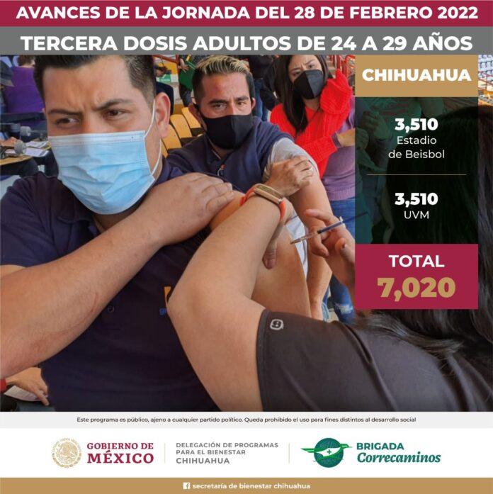 Chihuahua, Chih. (ADN / Martín Orquiz) – Fueron 7 mil 020 los hombres y mujeres de 24 a 29 años las que acudieron a aplicarse la tercera dosis de la vacuna contra el COVID-19 en la Ciudad de Chihuahua, dio a conocer personal de la Secretaría de Bienestar.