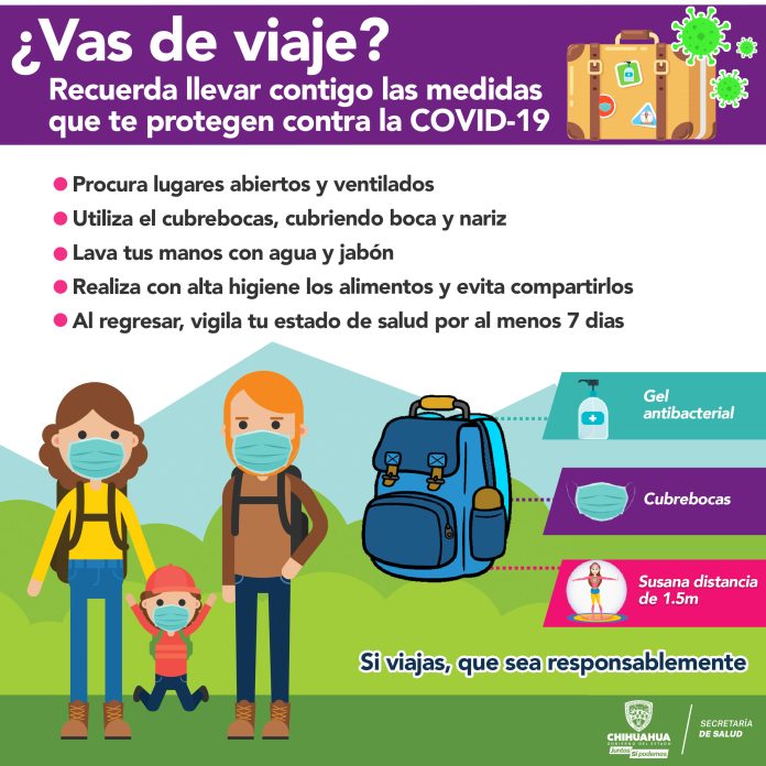 Chihuahua, Chih .- La Secretaría de Salud exhorta a la población en general, a reforzar las medidas de preventivas ante COVID-19, durante las actividades cotidianas y de forma particular al momento de realizar viajes o salidas de recreación.