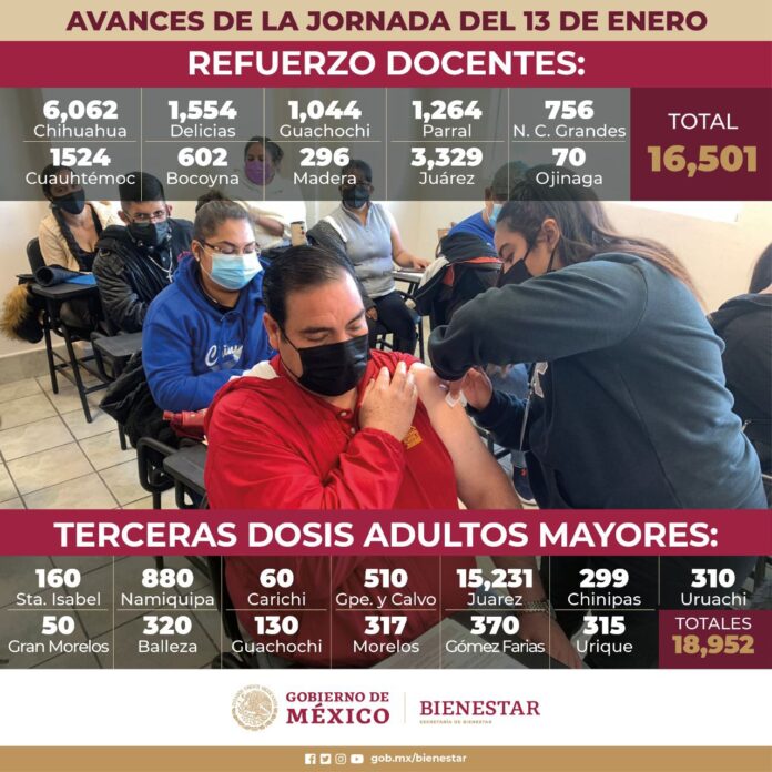 Ciudad Juárez, Chih. (ADN / Martín Orquiz) – Durante los cuatro días que lleva el operativo para aplicar la dosis de refuerzo contra el COVID-19 a personas de 60 años y más, se aplicaron 85 mil 383 inyecciones, dio a conocer personal de la Secretaría de Bienestar.