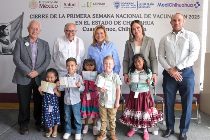 Chihuahua, Chih .- Con más de 90 mil dosis aplicadas en el estado, la gobernadora Maru Campos encabezó este viernes en el Hospital General Dr. Javier Ramírez Topete, de ciudad Cuauhtémoc, el cierre oficial de la Primera Semana Nacional de Vacunación 2025, en compañía del secretario de Salud del Gobierno de México, David Kershenobich.