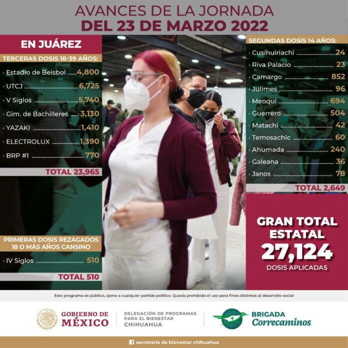 Ciudad Juárez, Chih. (ADN / Martín Orquiz) – En los 12 municipios donde ayer se realizaron acciones de vacunación, se aplicaron 27 mil 124 dosis para adultos, adolescentes de 14 años y personas que recibieron la primera dosis de Cansino, informó personal de la Secretaría de Bienestar.