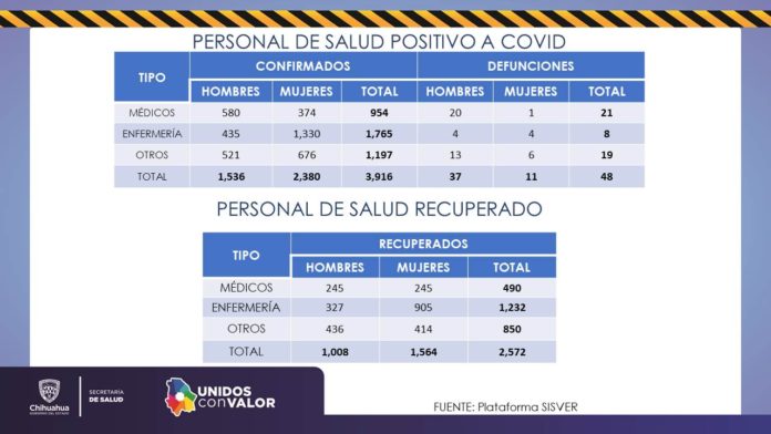 Chihuahua, Chih. – La Secretaría de Salud dio a conocer como parte del reporte técnico de COVID-19, que en el caso del personal que labora en el Sector Salud y que ha resultado positivo a la enfermedad, a la fecha se han recuperado 2 mil 572 personas, de un total de 3 mil 916 casos confirmados.