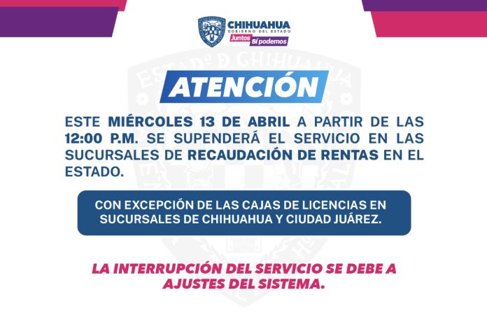 Chihuahua, Chih .- El Gobierno del Estado, a través de la Secretaría de Hacienda, da a conocer a la ciudadanía que mañana miércoles 13 de abril, se brindará servicio en el sistema de pagos hasta las 12 del día, esto por motivos de mantenimiento del servidor.