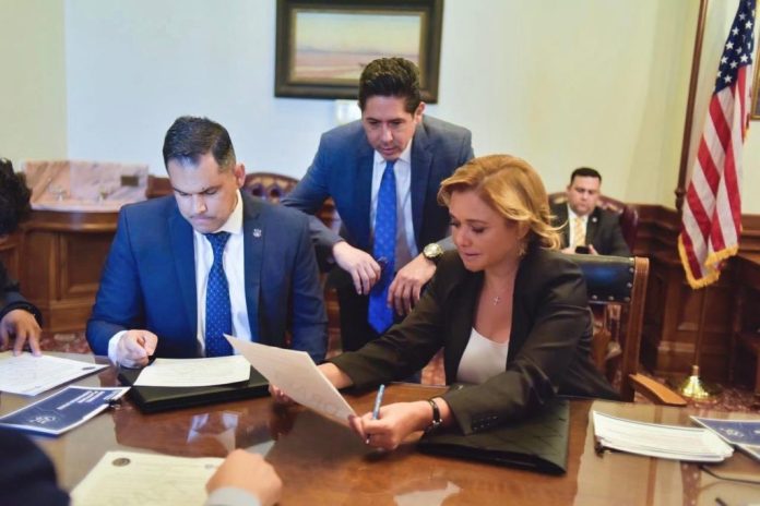 Dallas, Texas (ADN / Arturo Hernández) – Maru campos, gobernadora del estado de Chihuahua, y su homólogo de Texas, Greg Abbott, firmaron este mediodía un acuerdo que permitirá la suspensión de las revisiones adicionales en las unidades que transportan mercancías de Chihuahua al vecino estado norteamericano, situación que ha decir de los propios involucrados, había colapsado el comercio binacional en los últimos días.