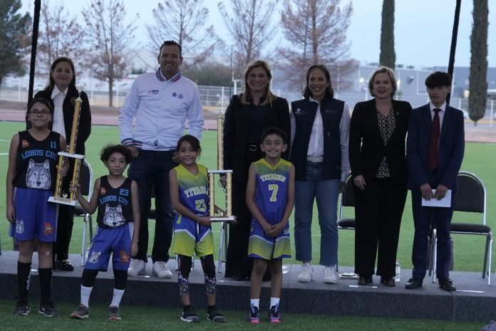 Entrega de espacios deportivos dignos combate inseguridad y adicción a drogas, según la diputada Adriana Terrazas. Gobernadora María Eugenia entrega trofeos a ganadores de torneo de fútbol y básquetbol. Presidente municipal destaca proyectos deportivos para elevar el nombre de Chihuahua.