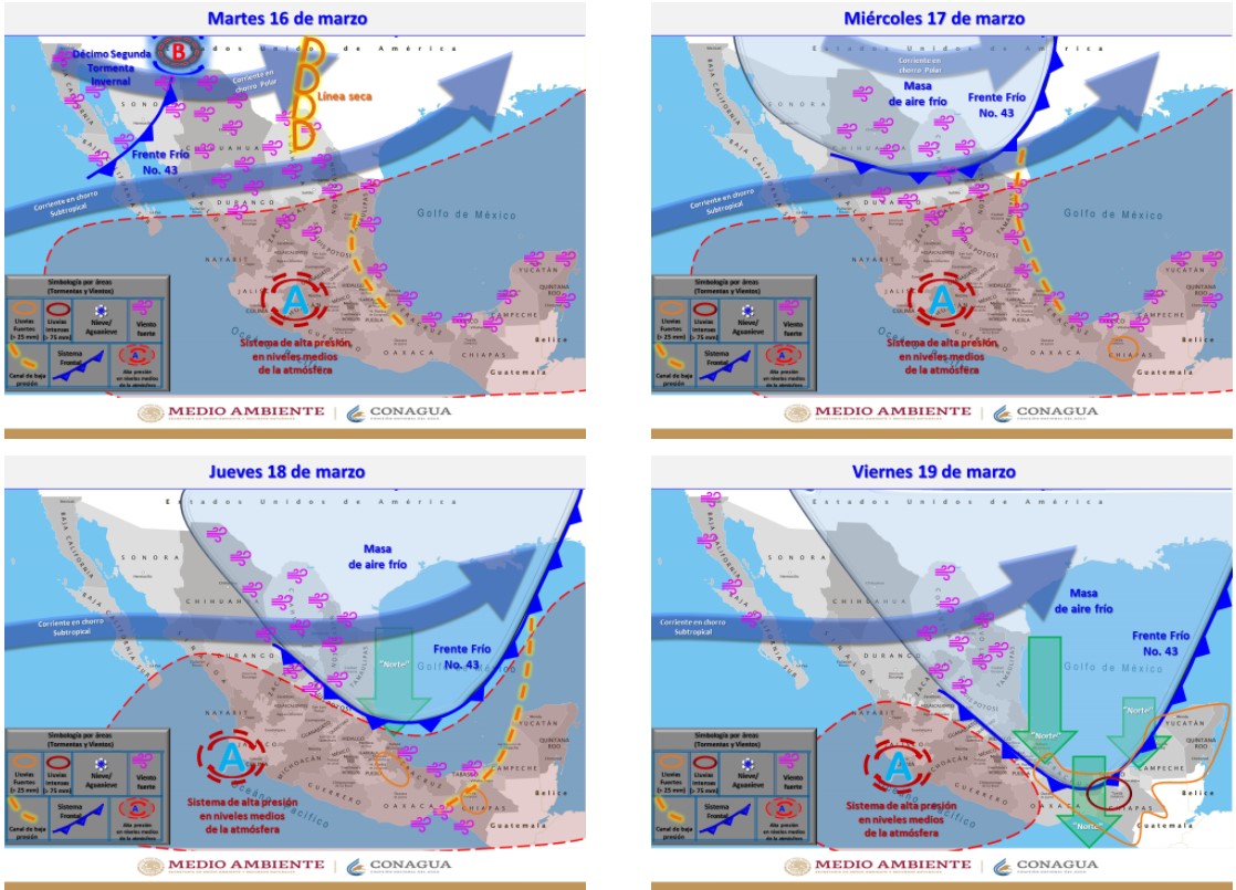 La entrada del nuevo Frente Frío por noroeste de la entidad, en interacción con la corriente en chorro y la Décimo Segunda Tormenta Invernal sobre el suroeste de Estados Unidos, favorece un ambiente frío por la mañana y de cálido a poco caluroso por la tarde, con cielo mayormente despejado y viento de 20 a 35 km/h.