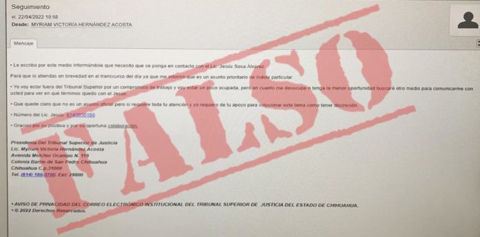 Chihuahua, Chih. (ADN / Martín Orquiz) – Personal de la Dirección de Tecnologías de la Información del Poder Judicial, detectó un mensaje generado a través de la cuenta [email protected], a través de la cual se solicita atención inmediata para una persona de nombre Jesús Sosa.