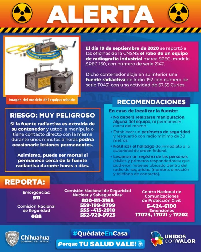 Chihuahua, Chih. – Ante el robo de una fuente radioactiva en el estado de Sonora, la Secretaría de Salud del Estado de Chihuahua pide a la población extremar precauciones y solicita que de tener conocimiento sobre su paradero, lo reporten de inmediato al número de emergencia 911 y eviten manipularlo.