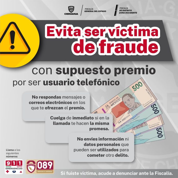 Chihuahua, Chih .- La mecánica de esta práctica fraudulenta comienza con un mensaje de texto SMS y posteriores llamadas telefónicas a los usuarios, indicándoles que fueron ganadores de un importante premio de entre los miles de clientes de las empresas AT&T, Telcel y Movistar.