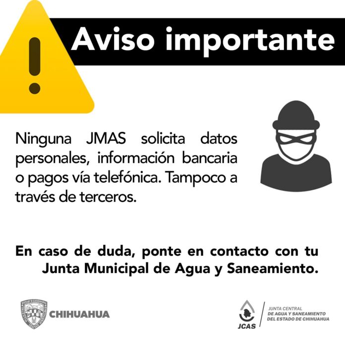 Chihuahua, Chih .- Derivado de reportes provenientes de distintas Juntas Municipales de Agua y Saneamiento (JMAS), donde supuestos trabajadores de las JMAS solicitan datos a los usuarios para “actualizar información”, “hacer llegar recibos extraviados” o “pagar vía telefónica con descuento”; La Junta Central de Agua y Saneamiento (JCAS), advierte a todos los usuarios que jamás se solicita información privada o sensible, y menos datos bancarios o de métodos de pago.