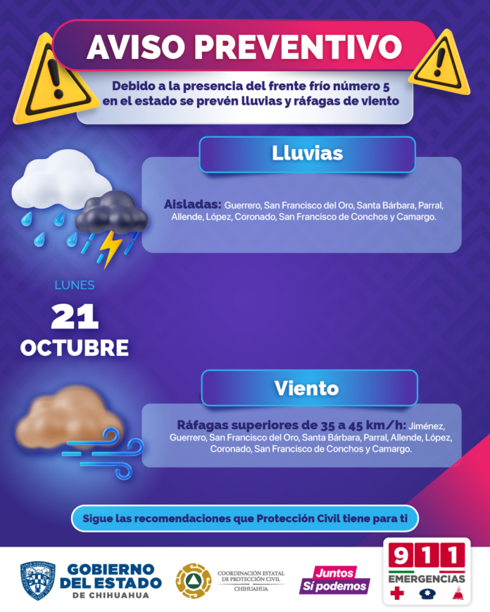 Para el lunes 21 de octubre se esperan rachas de viento de entre 35 y 45 kilómetros por hora, con el pronóstico de lluvias aisladas en localidades como Guerrero, San Francisco del Oro, Santa Bárbara, Parral, Allende, López, Coronado, San Francisco de Conchos y Camargo.