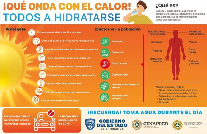 Chihuahua, Chih .– La Coordinación Estatal de Protección Civil (CEPC) dio a conocer que para este lunes 17 y el martes 18 de junio, se prevé que la combinación de diversos sistemas atmosféricos genere un ambiente muy caluroso en gran parte de la entidad, con fuerte radiación solar y presencia de vientos moderados.