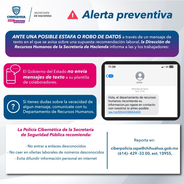 La Dirección de Recursos Humanos de la Secretaría de Hacienda, emitió una alerta dirigida a las y los trabajadores del Gobierno del Estado, para que eviten ser víctimas de una posible estafa o del robo de sus datos personales, a través de un mensaje de texto que es enviado a sus teléfonos móviles.