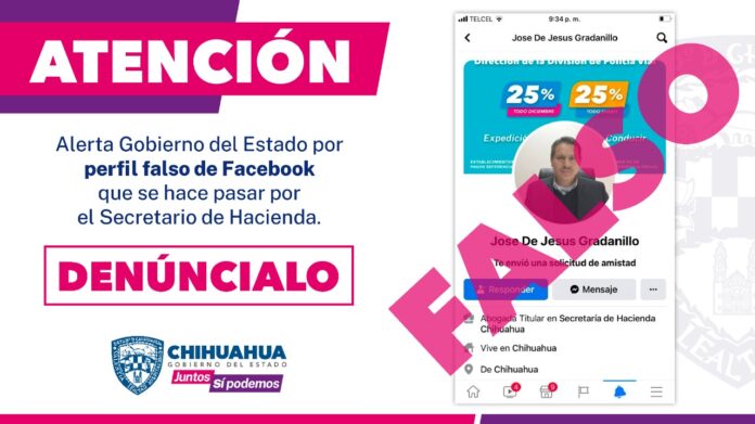 Chihuahua, Chih .- El Gobierno del Estado, alerta a la ciudadanía en general, así como a los miembros de los Ayuntamientos del Estado a no dejarse engañar por un perfil falso en la red social Facebook que se hace pasar por el Secretario de Hacienda, José de Jesús Granillo, esta es la tercera ocasión en el año en que estafadores buscan engañar a presidentes municipales y ciudadanía en general a través de un perfil del titular de Hacienda.