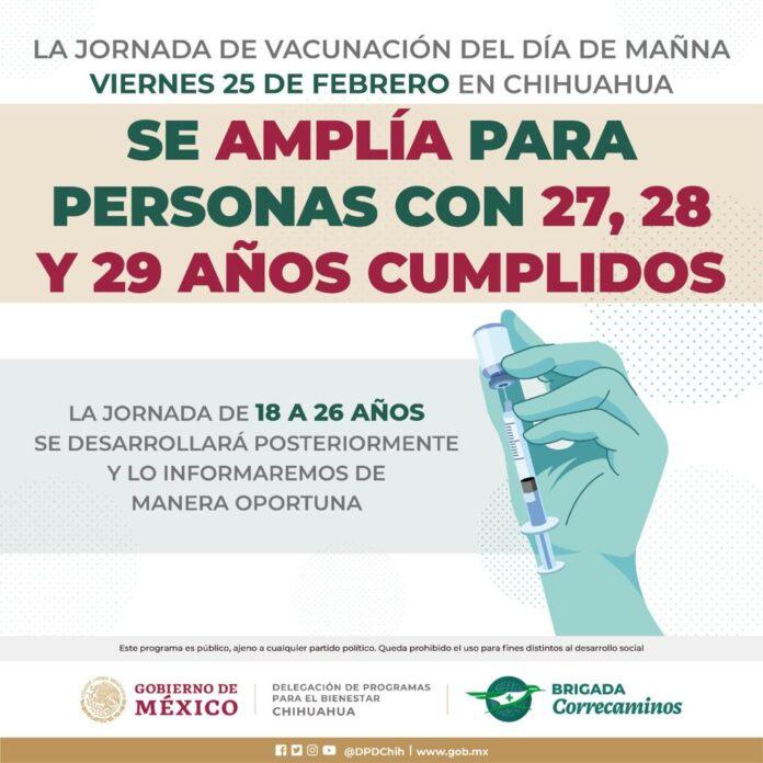 Chihuahua, Chih. (ADN / Martín Orquiz) – El operativo especial de vacunación de refuerzo para personas de 29 años, se amplía para personas de 28 y 29 años, informó personal de la Secretaría de Bienestar.