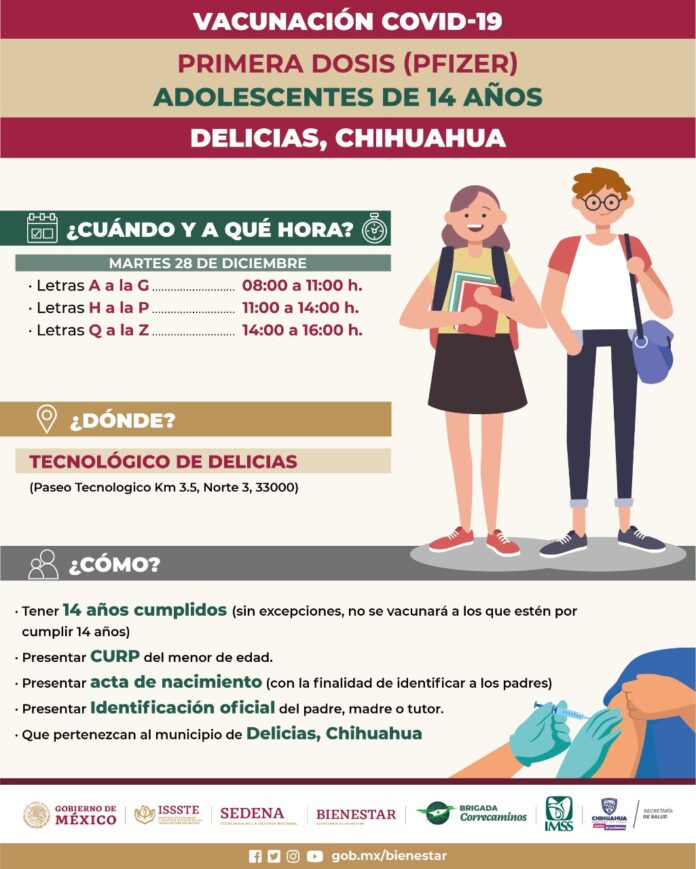 Chihuahua, Chih. (ADN / Martín Orquiz) – Adolescentes de 14 años del Municipio de Delicias serán objeto de una jornada de vacunación contra el COVID-19 este martes 28 de diciembre, con la que se pretende inmunizar a casi 3 mil menores, dio a conocer el delegado de los Programas para el Desarrollo, Juan Carlos Loera de la Rosa.
