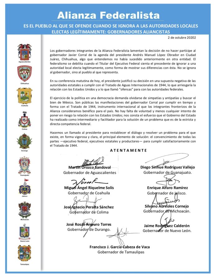 También los Gobernadores Aliancistas emitieron un comunicado en respaldo al pueblo y al Gobierno del Estado de Chihuahua, señalando que “Es el pueblo al que se ofende cuando se ignora a las autoridades locales electas legítimamente”.