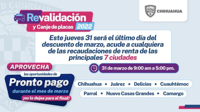 Chihuahua, Chih .- La Secretaría de Hacienda de Gobierno del Estado, informó que este jueves 31 de marzo, es el último día para aprovechar las oportunidades de pronto pago en revalidación y cambio de placas.