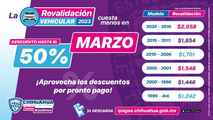 Chihuahua, Chih .- Durante el mes de febrero los automóviles del 2024 a 2016 deberán pagar 2 mil 58 pesos; mientras que los modelos del 2015 al 2011 deberán pagar mil 85; la revalidación para automóviles del 2010 al 2006 es de mil 701 pesos; para unidades del 2005 al 2001 será de mil 548; del 2000 a 1996 es de mil 446 pesos y de 1995 y años anteriores será de 1242 pesos.