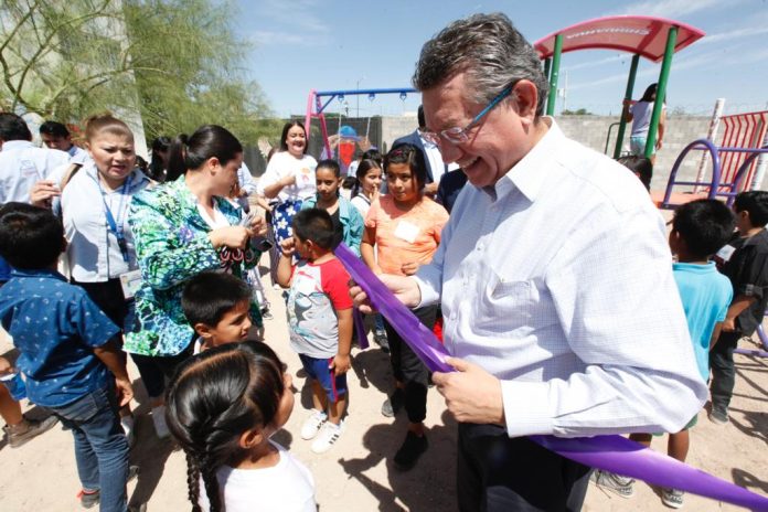 Ciudad Juárez, Chih .- Durante la inauguración de juegos infantiles y aparatos ejercitadores en colonia Riberas del Bravo Etapa 3, el representante de la Gobernadora Maru Campos Galván en la Zona Norte, Oscar Ibáñez Hernández, invitó a los asistentes a aprovechar los programas estatales de beneficio comunitario para esta zona de la ciudad.