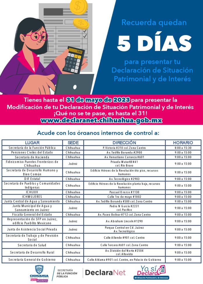 Cabe señalar que la fecha límite para cumplir con la obligación es el 31 de mayo, por la que la SFP invita a todas y todos los servidores públicos que requieran auxilio o tengan dudas en el llenado de su declaración, a que se acerquen al órgano interno de control mas cercano o a la Dirección de Evolución Patrimonial.