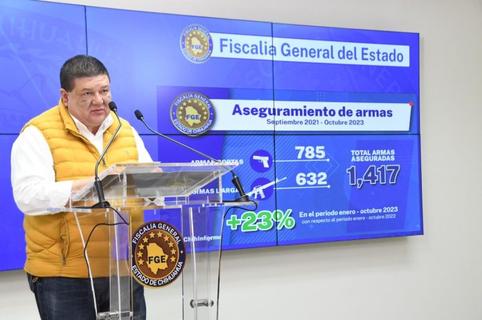 Chihuahua, Chih .- De enero a octubre del presente año, la Fiscalía General del Estado ha superado los aseguramientos de drogas y armas con respecto al mismo periodo del 2022, informó esta mañana el Fiscal General César Jáuregui Moreno.