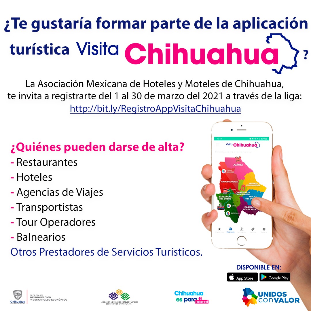 Chihuahua, Chih.- La Secretaría de Innovación y Desarrollo Económico (SIDE), en conjunto con la Asociación Mexicana de Hoteles y Moteles de Chihuahua, invita a prestadoras y prestadores de servicios turísticos a formar parte de la aplicación “Visita Chihuahua”.