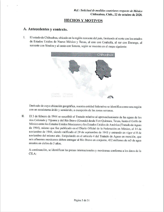 En el documento de solicitud que consta de 31 páginas, piden además el establecimiento de una mesa de diálogo que permita encontrar una solución de fondo sobre las obligaciones de asignación de agua, derivadas del Tratado de Aguas de 1944, y se tengan las reservas necesarias para el ciclo agrícola 2021.