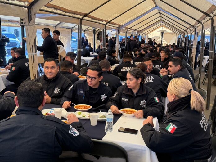 Ciudad Juárez, Chih. (ADN/Arturo Hernández) – La Policía del Estado conmemoró el Día del Policía con un desayuno tradicional de menudo ofrecido a las y los agentes estatales en las instalaciones de la Secretaría de Seguridad Pública del Estado (SSPE) en Ciudad Juárez.