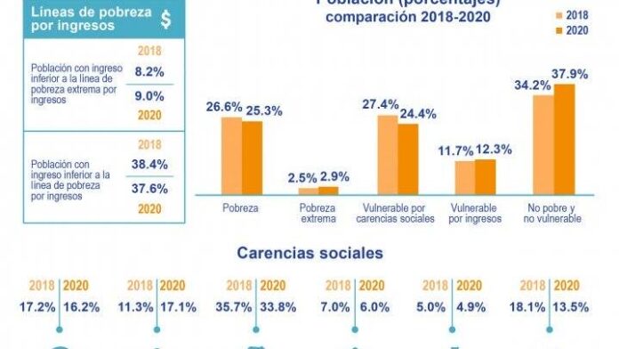 El informe comparativo entre 2018 y 2020 señala que a nivel nacional el porcentaje de la población en situación de pobreza aumentó de 41.9% a 43.9%, mientras que el número de personas en esta situación pasó de 51.9 a 55.7 millones de personas.