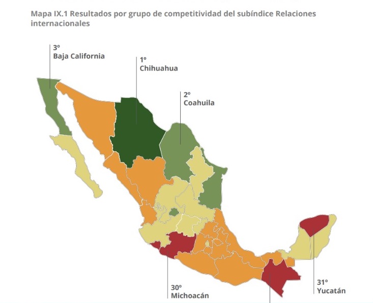 “En 2018 esta entidad (Chihuahua) destacó en dos de los cuatro indicadores estudiados al ser la que más mercancías exportó como porcentaje de su PIB (exportó mercancías con un valor superior al de su PIB: un 132.8%), así como la quinta entidad que más inversión extranjera directa (IED) atrajo, en promedio, entre 2016 y 2018 (2.3 dólares por cada mil pesos de PIB)”, señala el reporte de IMCO respecto al logro en relaciones internacionales.