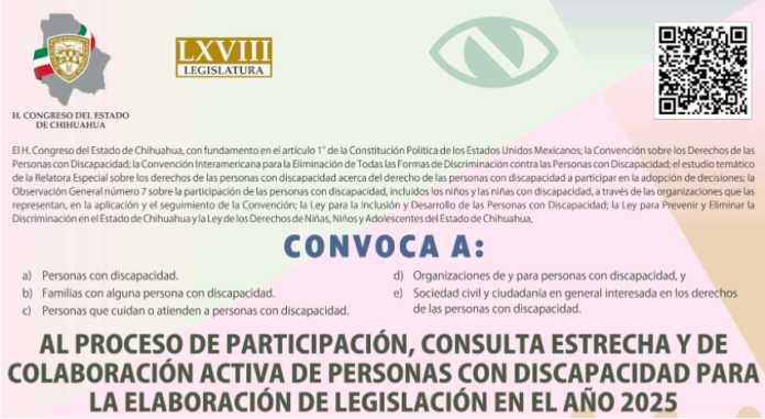 El Congreso del Estado de Chihuahua, a través de la Comisión de Derechos Humanos y Atención a Grupos Vulnerables, dará inicio el próximo lunes 09 de junio al Proceso de Participación, Consulta Estrecha y de Colaboración Activa de Personas con Discapacidad.