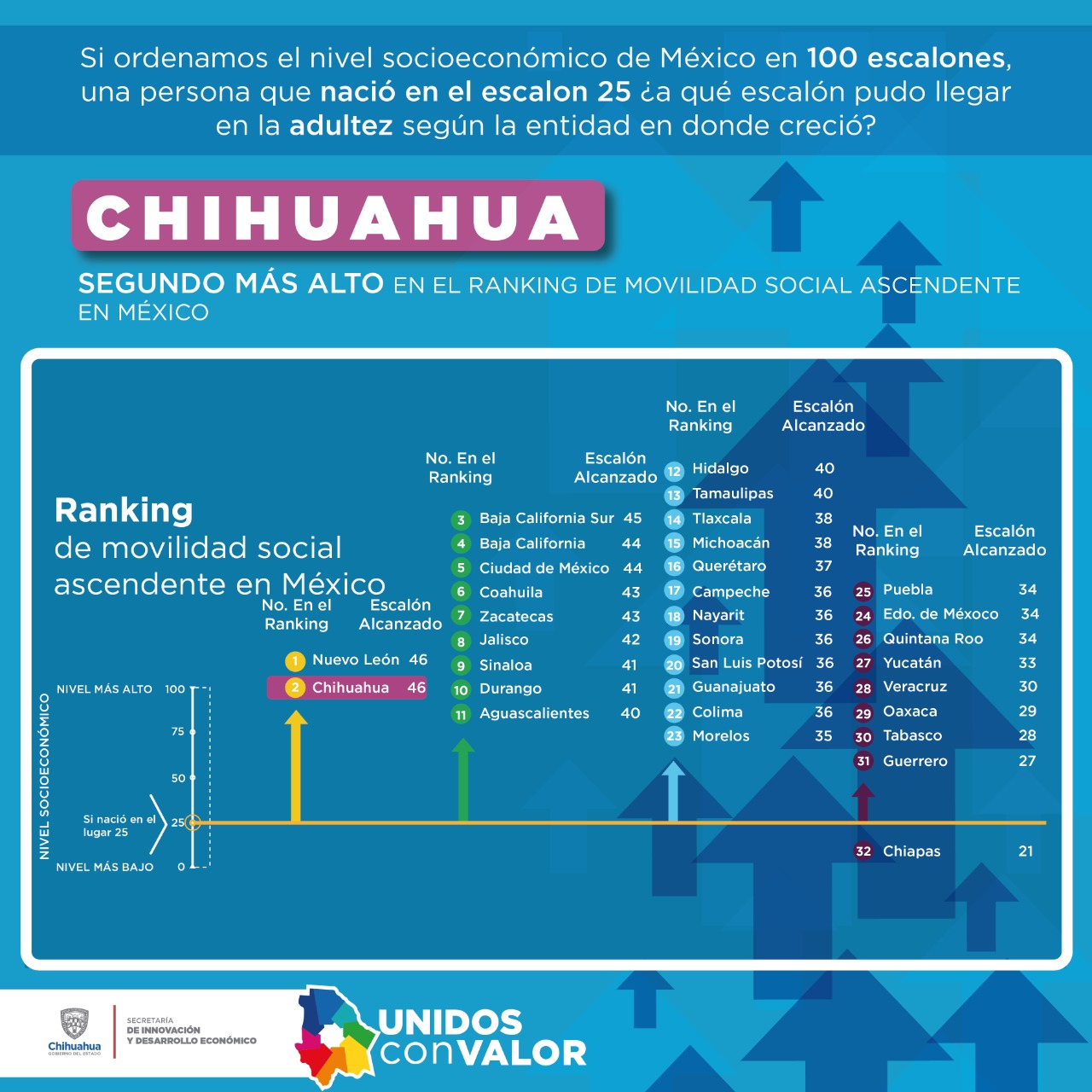 Chihuahua y Nuevo León ocupan el lugar número uno, seguidos de Baja California Sur, Baja California, Ciudad de México, Coahuila, Zacatecas, Jalisco, Sinaloa, Durango, Aguascalientes, Hidalgo, Tamaulipas, Tlaxcala, Michoacán, Querétaro, Campeche, Nayarit, Sonora, San Luis potosí, Guanajuato y Colima.